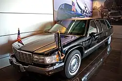 In 1993, after president Bill Clinton took office, a then brand-new 1993 Fleetwood would become his state car that he would use throughout his term until 2001. Following a long tradition of Lincoln-based sedans, this was only the second Cadillac since the 1983 Fleetwood built for the Ronald Reagan administration. Along with advanced security and safety features, the limousine featured communication devices such as phones, satellite communications and the Internet.[19] After Clinton left office, the car eventually was displayed at the Clinton Presidential Center in Little Rock, Arkansas. To prevent third parties from learning classified details about the protection and security features of the vehicle, the Secret Service keeps the doors secured at all times.[20]