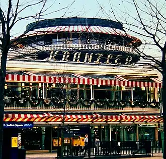 The Charlottenburg branch was opened in 1932, in the rooms of the former Café des Westens on Kurfürstendamm No. 18/19, which ran till the building's destruction in 1945. After the war, the building was reconstructed employing contemporary model designs.[1] However, the renovation disregarded historic features and height limitations of the building.[1] Following the renovations business was resumed at the site in 1951. The current flat-roofed Kranzler-Eck building, with its distinct rotunda and red-white touched awnings, was erected in 1957/58. The Charlottenburg branch, in what was then West Berlin, went on to become a major tourist attraction of the Wirtschaftswunder era.