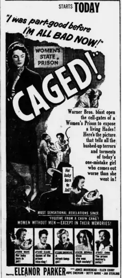 Caged is a 1950 American film noir[2] directed by John Cromwell and starring Eleanor Parker, Agnes Moorehead, Betty Garde, Hope Emerson, and Ellen Corby. It was adapted by Virginia Kellogg from the story "Women Without Men" by Kellogg and Bernard C. Schoenfeld.