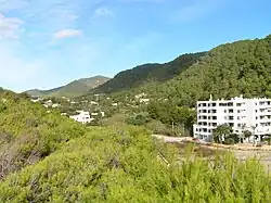 This resort is in the isolated north-eastern tip of the island.[2] It is a relatively quiet and child-friendly bay with a wide sandy beach.[2] The bay is enclosed by steep cliffs to the south and the Sa Talaia which at its peak is 303 meters[2] above sea level. The beach has clear, clean shallow waters.