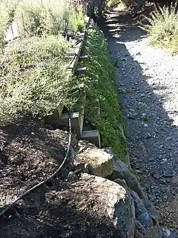 ![]() Creek bank restored by SCVWD with timber cribs and native plants next to Calabazas Park north of Rainbow Drive, San Jose, California. | |