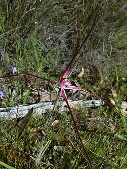 Caladenia erythronema, commonly known as the red thread spider orchid[2] and Nyabing spider orchid,[3] is a plant in the orchid family Orchidaceae and is endemic to the south-west of Western Australia. It has a single hairy leaf and up to three red, yellow or cream-coloured flowers with dangling, thread-like sepals and petals and a small labellum.