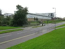 Calderglen High School (Scottish Gaelic: Àrd-sgoil Ghlinn Challdair) is a state-run secondary school in the St Leonards area of the Scottish new town East Kilbride, in South Lanarkshire. The complex of buildings is situated on the precipitous bank of the Rotten Calder Water, overlooking a meander named the 'School Bend'. The school derives its name from the Calder Glen (gorge) which the river occupies, which is a site of special scientific interest (SSSI). The school has a potential pupil roll of approximately 1800, with 130 teachers, making it one of the largest secondary institutions in Europe. The school's houses are named Jura, Uist, Harris, Tiree and Lewis.[2]