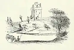 An engraving by A. Robertson after a sketch by Paul Sandby from c. 1750 depicts the castle viewed from the south. The engraving is recorded as having featured in Forsyth's Beauties of Scotland, although this book does not contain the engraving. The engraved view does appear in the August 1788 edition of the "Edinburgh Magazine or Literary Miscellany".[12] An original finished watercolour of the scene was sold a few decades ago privately by public auction. Sandby worked the latter view up from a simpler bistre sketch of the same view, upon which the later engraving is based. This original sketch is held by the National Library of Wales and originally belonged to the antiquarian and naturalist Thomas Pennant.