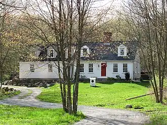 A short way north of the main house stands a 1+1⁄2-story Cape, also of wood-frame construction. It has a side-gable roof pierced by two gabled dormers, a central chimney, and clapboarded exterior. A three-bay ell to the left nearly doubles the size of the house; it houses a secondary entrance, and its roof has three dormers. The main entrance features a Greek Revival surround. This house was built in 1836, by family lore due to a dispute involving a spinster aunt, who then resided here.[2]
