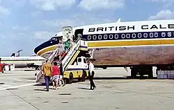 Caledonian operated its inaugural flight on 29 November 1961 from Gatwick, the newly formed airline's main operating base, to Barbados.[2][3][18][19][20] The first revenue service, an immigrant charter under contract to London Transport Executive, operated the following day in the opposite direction.[17][21]