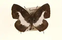 Upperside: black; a medial broad oblique white band across both forewings and hindwings broadening on the latter, on the forewing it extends further towards the costa in the female than in the male and in most specimens, both male and female, it is slightly produced outwards above vein three.