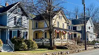 The Califon Historic District is a 164-acre (66 ha) historic district encompassing much of the borough. It was added to the National Register of Historic Places on October 14, 1976, for its significance in commerce. The district includes 154 contributing buildings, three contributing structures, and one contributing site.[24] It was created through the efforts of the Califon Historical Society. Califon is a Victorian-style enclave where the houses are marked with the names of the builders and their dates of establishment rather than with street numbers.