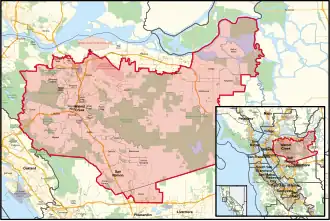 Alameda County is split between this district and the 12th , 14th , and 17th districts. They are partitioned by Sinclair Freeway, Amador Valley Blvd, Emerald Ave, Tamarack Dr, Brighton Dr, Ione Way, Newcastle Ln, Dougherty Rd, Highway 580, Lembert Hills Dr.