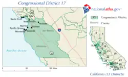 Santa Clara County is split between this district, the 16th district, and the 18th district. The 17th and 16th are partitioned by Stevens Creek Blvd, Santana Row, Olsen Dr, S Winchester Blvd, Williams Rd, Eden Ave, Lexington Dr, Valley Forge Way, Gleason Ave, Moreland Way, Payne Ave, Saratoga Ave, Doyle Rd, Highway G2, Royal Ann Dr, Wisteria Way, Rainbow Dr, Highway 85, S De Anza Blvd, Prospect Rd, Fremont Older Open Space, Permanente Creek, Highway 280, N Foothill Blvd, Homestead Rd, Stevens Creek, W EL Camino Real, Magritte Way, Highway G6, Highway 101, and Enterprise Way. The 17th and 18th are partitioned by Steven's Creek Blvd, Di Salvo Ave, Bellerose Dr, Forest Ave, Wabash Ave, W San Carlos St, Race St, The Alameda, University Ave, Elm St, Highway 82, Newhall St, Morse St, Idaho St, Alameda Ct, Sherwood Ave, Hamline St, Highway 880, Highway 101, McKee Rd, Toyon Ave, Penitencia Creek Rd, Canon Vista Ave, Crothers Rd, Alum Rock Park, Sierra Rd, Felter Rd, Weller Rd.