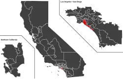 The district includes most of coastal Orange County, including Seal Beach, Huntington Beach, Newport Beach, Emerald Bay, Laguna Beach, and Dana Point; San Clemente; the Little Saigon area of northwestern Orange County, including Garden Grove, Westminster, Fountain Valley, Midway City, Stanton, Cypress, La Palma, Rossmoor, and Los Alamitos; and Artesia, Cerritos, and Hawaiian Gardens in southeastern Los Angeles County.