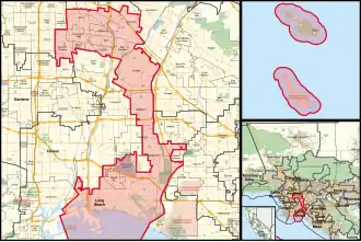 Under the 2020 redistricting, California's 42nd congressional district has been geographically shifted to the South Bay region of Los Angeles County. It also takes in two of the Channel Islands: Santa Catalina and San Clemente, in the Southern California Bight. The district also includes the cities of Huntington Park, Bell, Bell Gardens, Maywood, Signal Hill, Vernon, Cudahy, Commerce, south Long Beach, east side Lakewood, most of Downey and Bellflower; and the census-designated places Florence-Graham and Walnut Park.