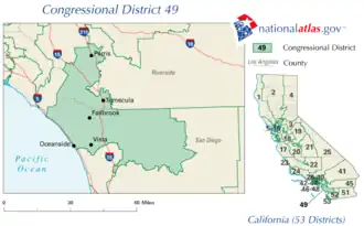Under the 2020 redistricting, California's 49th congressional district is located in Southern California, covering the North County region of San Diego County and southeast Orange County. The area in San Diego County includes the cities of Carlsbad, Oceanside, Encinitas, Solana Beach, Del Mar, and Vista; and the census-designated places Camp Pendleton Mainside and Camp Pendleton South. The area in Orange County includes the cities of San Clemente, San Juan Capistrano, Dana Point, and Laguna Niguel; and the census-designated places Ladera Ranch, Las Flores, and Rancho Mission Viejo.