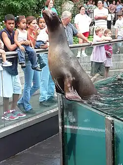 Because of their intelligence and trainability, California sea lions have been used by circuses and marine mammal parks to perform various tricks such as throwing and catching balls on their noses, running up ladders, or honking horns in a musical fashion. Trainers reward their animals with fish, which motivates them to perform. For ball balancing, trainers toss a ball at a California sea lion so it may accidentally balance it or hold the ball on its nose, thereby gaining an understanding of what to do. A California sea lion may go through a year of training before performing a behavior for the public. However, its memory allows it to perform a behavior even after three months of resting.[34] Some organizations, such as the Humane Society of the United States and World Animal Protection, object to using California sea lions and other marine mammals for entertainment, claiming the tricks are "exaggerated variations of their natural behaviors" and distract the audience from the animal's unnatural environment.[41]