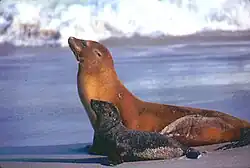 Female California sea lions have a 12-month reproductive cycle, consisting of a 9-month actual gestation and a 3-month delayed implantation of the fertilized egg before giving birth in June or July. Interbirth intervals are particularly long for this species, being 21 days for sea lions off California and more than 30 days for sea lions in the Gulf of California.[32] Females remain with their pups onshore for 10 days and nurse them. After this, females will go on foraging trips lasting as long as three days, returning to nurse their pups for up to a day. Pups left onshore tend to gather in nurseries to socialize and play.[9] When returning from a trip, females call their pups with distinctive calls to which the pups will reply in kind. A mother and pup can distinguish each other's calls from those of other mothers and pups. At first, reunions largely depend on the efforts of the mothers. However, as pups get older, they get more involved in reunions.[33] Older pups may sometimes join their mothers during their foraging trips.[9] Adult male California sea lions play no role in raising pups, but they do take more interest in them than adult males of other otariid species; they have even been observed to help shield swimming pups from predators.[34] Pups are weaned by a year but can continue to suckle for another year.[4]