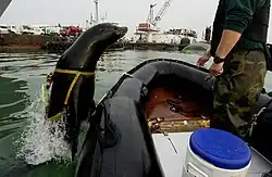 The California sea lion is used in military applications by the U.S. Navy Marine Mammal Program, including detecting naval mines and enemy divers. In the Persian Gulf, the animals can swim behind divers approaching a US naval ship and attach a clamp with a rope to the diver's leg. Navy officials say California sea lions can do this in seconds, before the enemy realizes what happened.[42] Organizations like PETA believe that such operations put the animals in danger.[43] However, the Navy insists that California sea lions are removed once their mission is complete.[44]
