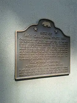 The First California State Fair was held, beginning on October 4, 1854, in San Francisco at the Music Hall on Bush Street, close to Montgomery Street, with the stock being shown at Mission Dolores.[11] The site is now California Historical Landmark No. 861.[12] At this time the fair was held in a different city each year with Sacramento hosting the following year, in 1855.[13] It then moved to San Jose in 1856,[14] Stockton in 1857,[15] and Marysville in 1858.[16]