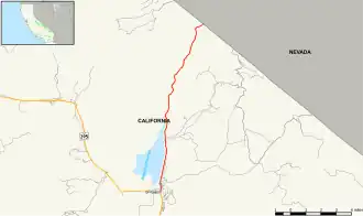 Except where prefixed with a letter, postmiles were measured on the road as it was in 1964, based on the alignment that existed at the time, and do not necessarily reflect current mileage. R reflects a realignment in the route since then, M indicates a second realignment, L refers to an overlap due to a correction or change, and T indicates postmiles classified as temporary (for a full list of prefixes, see California postmile § Official postmile definitions).[1] Segments that remain unconstructed or have been relinquished to local control may be omitted. The entire route is in Mono County.