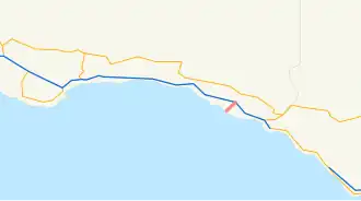 Except where prefixed with a letter, postmiles were measured on the road as it was in 1964, based on the alignment that existed at the time, and do not necessarily reflect current mileage. R reflects a realignment in the route since then, M indicates a second realignment, L refers to an overlap due to a correction or change, and T indicates postmiles classified as temporary ().[6] Segments that remain unconstructed or have been relinquished to local control may be omitted. The entire route was in Carpinteria, Santa Barbara County.
