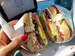 The backbone of Call Your Mother's menu includes a variety of bagels (including everything, za'atar, sesame, cheese, and maple salt and pepper) and specialty schmears (such as garlic-herb, roasted vegetable and candied salmon cream cheeses).[2] Specialty bagel sandwiches include the "Sun City" (bacon or pastrami, bodega-style eggs, cheese and spicy honey), the "Mountain View" (mashed avocado, bodega-style eggs, latkes and cheese) and the "Gleneagle" (candied salmon cream cheese, cucumber, crispy shallots and lettuce).[9][10] Call Your Mother also offers traditional deli sandwiches on challah and rye as well as baked goods.[5]