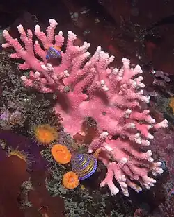 Two individuals of Calliostoma annulatum are visible on this hydrocoral