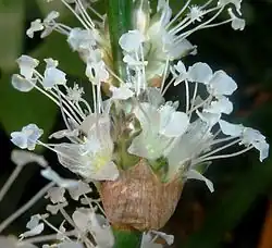 The lanceolate to ovate, white petals have no flat blade. They are 5 to 6 millimeters long and 2.5 to 3.5 millimeters wide. The six long, protruding, white stamens are more conspicuous than the petals. Their connectives are membranous. The stigma is brush-shaped.[4][5]