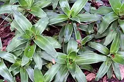 Flowering shoots are bromeliad-like, vigorous, and covered with almost rosette-like leaves. They are sparsely branched. Long, fairly slender, distichous stolons emerge from the lower nodes. The leaves of flowering shoots are up to 30 centimeters long and 7 centimeters wide. They are bright light green, narrowly elliptic-lanceolate, pointed, almost stem-clasping, and usually glabrous.