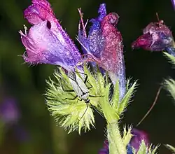 Calocoris nemoralis can reach a length of 8.5–9 millimetres (0.33–0.35 in) in males, of 8.2–9.5 millimetres (0.32–0.37 in) in females.[5] Bodies af these bugs are elongated. The head is black, very rarely clear. The dorsal surface is covered with dense black hairs. The membrane is black. Legs are black, femurs and tibiae are often partly red or yellow.[5]
