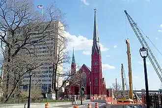 ![]() Calvary Presbyterian Church during construction on the Marquette Interchange | |