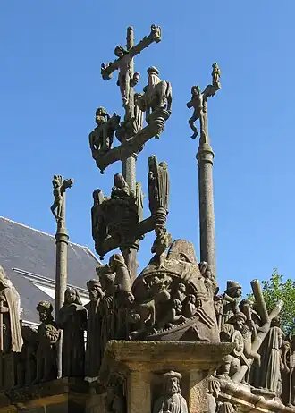 The Calvary of Plougastel-Daoulas in the arrondissement of Brest comprises a raised octagonal pedestal made from the yellow granite of Logonna-Dāaoulas, flanked by four thick arched buttresses. All the sculptural work is by the Maître de Plougastel except the horseman on the left of the crucifix which is by Millet.[1] It is a listed historical monument since 1889.[2]