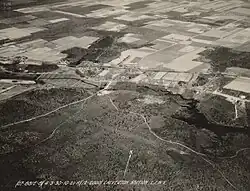 Calverton station was originally built around 1880 as Baiting Hollow. It was also intended to be the terminus of one of two formerly proposed extensions of the Wading River Branch.[2] The depot closed and moved to undisclosed location around 1922 and second depot built further east around same year, which was located on Railroad Avenue between North River Road and Edwards Avenue. Calverton was the site of the deadly Golden's Pickle Works wreck on Friday, August 13, 1926.[3] The station closed in 1981. The disused metal station shelter currently remains.[4][5][6]