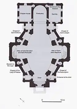 Interior decorations are in rococo style. the church has an octagonal plan cut by cross. Presbytery is a double span, closed semicircular. There is an octagonal nave, which cut transept by transverse axis. The transept is made by two symmetrical chapels. We can observe a great sailing vault. On the diagonal axes are four chapels lower than those which determine presbytery. Consistency adds fact that the whole interior has part of Corinthian style for example columns. Between the chapels there are placed narrow passages.
