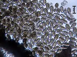 Camarosporium spp. spores are ~20 µm long, apple-seed shaped, and often amber-colored