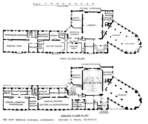 The Medical School building is Prior's largest work. Two of Prior's former clients, Dr Allbutt and the Rev. J. B. Lock, were on the committee that appointed the architect. Prior received an honorarium of only 100 guineas for the plans and elevations. He chose to adopt a classical idiom partly as a result of pressure from the committee.