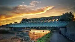 On 23rd December 2021, the Abbey-Chesterton Bridge over the River Cam opened, providing cycle and pedestrian access to the station from the Abbey district of Cambridge and from Fen Ditton. The bridge is part of the Chisholm Trail, a footpath and cycle route linking Cambridge Science Park with Addenbrookes Hospital and Cambridge Biomedical Campus in the south of the city. [49] The bridge provides pedestrian access to the Abbey Stadium, Cambridge United Football Club's home ground, approximately 1.5km (1 mile) away.