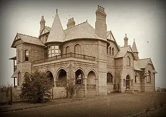 His first association with architect John Horbury Hunt was in about 1873 when Horbury Hunt carried out large scale extensions to newly purchased Cranbrook, Rose Bay. In the following year James White entered the Legislative Council and took on a range of committee positions, including the Royal Society and was a founding member of the natural history Linnean Society of NSW, the Agricultural Society of NSW, the Horticultural Society of NSW, the Union Club, the Animals' Protection Society of NSW, the Warrigal Club and a director/chairman of the Mercantile Bank of Sydney. In light of his passion for racing, he was a long-time member of the Australian Jockey Club and became chairman in 1880 and then again between 1883 and 1890.[1] White must have been impressed by Hunt's extensions to Cranbrook as he engaged Hunt in 1888 to build him a "rural seat" at Kirkham. Allegedly, the finances for Kirkham came from the prize money of one of White's most successful horses, Chester.[1] In early 1890 White began selling his race horses and retiring from committees. He died at Cranbrook on 13 July 1890, perhaps never having lived in Hunt's creation at Kirkham. The property was left to his wife, who sold it about ten years later to the Faithfull Anderson family. Their interest may have been the success White had achieved with his horse stud, given they also had interests in horse racing.[1]