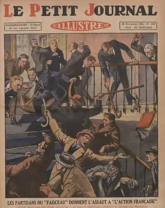 On 11 November 1925, Georges Valois, a former member of Action Française, founded the first French fascist party, baptized Faisceau. This short-lived group intentionally overshadowed Action Française. Indeed, when he left Maurras, Georges Valois allegedly took with him the subscriber list of L'Action française.[41] When it was created, the Faisceau stole 1800 adherents from the Action française between December 1925 and April 1926 in Paris alone.[42][41] As a repeat offence, the Camelots du Roi sabotaged a meeting of the University Beam at the Salle d'Horticulture in Paris on 15 December 1925 by routing Georges Valois[43].[44] Consequently, René Bardy, a former communist, was instructed by Georges Valois "to set up a security service capable of facing both Maurras's troops and those of the Communist Party".[41]
