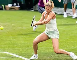 Giorgi qualified for the Wimbledon Championships for the second year in a row defeating Emily Webley-Smith, Olivia Rogowska, and Alexa Glatch. In the first round, she beat 16th seed and compatriot Flavia Pennetta.[18] Then she defeated Anna Tatishvili 6–3, 6–1, and in the third round 20th seed Nadia Petrova, 6–3, 7–6, to reach the fourth round of a Grand Slam for the first time in her career.[19] However, Giorgi's Wimbledon run came to an end when she lost in the fourth round to third seed and eventual finalist, Agnieszka Radwańska, 2–6, 3–6.[20] In June, it was reported that Giorgi was considering immigrating to Israel to play on the Israel Federation Cup team.[21] Raphael Gellar of Israel Sports Radio said that "based on her ranking ... [she] would automatically ... [be] second on the team following Shahar Pe'er."[9] Giorgi began US Open Series by playing at the Carlsbad Open. As the top seed in qualifying, she lost in the first round to Noppawan Lertcheewakarn. Giorgi then received a wildcard to compete at the Washington Open. She was defeated in the first round by Irina Falconi, in three sets.[22] Playing as a wildcard at the Cincinnati Open, Giorgi beat 14th seed and compatriot Francesca Schiavone in the first round, 6–1, 6–3.[23] In the second round, she lost to wildcard Sloane Stephens, in straight sets.[24]