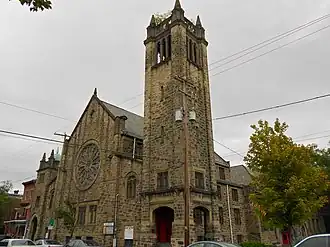 The rear section of this church was built in 1895 as the congregation's primary place of worship. The cornerstone for a new, larger sanctuary was subsequently laid in the fall of 1915;[16] that section, which was attached to the church's front on Sixth Street, was completed in 1916, and featured a high tower and belfry with parapets and pinnacles.