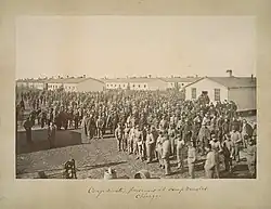 By November 15, 1861, Camp Douglas housed about 4,222 volunteer soldiers from 11 regiments.[24] By February 1862, the recruits suffered 42 deaths by disease.[24] According to George Levy's 1999 history of the camp, a total of about 40,000 Union Army recruits passed through the camp for outfitting and training before the facility was permanently converted to a prisoner-of-war camp.[25] A 1960 history by Eisendrath estimated the number of recruits as 25,000 based on his sources at the time.[26] Colonel Tucker's job as camp commander was not easy; he had to use increasingly hard measures to curb considerable drunk and disorderly conduct by recruits in camp. He also had to supervise their conduct and sometimes take punitive action against them for acts in the city of Chicago, where the soldiers abused pass privileges.[27]