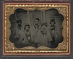 Governor Yates put Colonel Joseph H. Tucker, commanding the 60th Regiment, Illinois State Militia, in charge of building the camp.[22] Yates also appointed Tucker as the camp's first commander.[22] State militia troops called the Mechanics Fusileers, who were apprentice and journeyman carpenters, built the barracks in October and November 1861.[17] These troops mutinied on December 18, 1861, when the State of Illinois tried to press them into service as infantry upon completion of their work on Camp Douglas.[23] The State paid them less than they believed they were promised for their work.[23] Regular troops had to suppress the rioting construction troops and restore order to the camp.[24] After the Mechanics Fusileers repaired damage that they had caused to a fence, they were allowed to return home.[24]