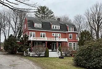 Camp Hammond is located off the north side of Main Street (Maine State Route 115) in Yarmouth's town center, between the Sacred Heart Catholic Church and the Rowe School. It is a large 2+1⁄2-story wood-frame structure, with a gambrel roof, shingled exterior, and fieldstone foundation. The roof has three shed-roof dormers, each with differing window shapes and configurations. The main facade, facing roughly south, is divided into three sections. The rightmost section is a rounded bay, with three large sash windows on the first level and two smaller ones on the second. The central section houses the main entrance, flanked by fixed multipane windows, and a three-part window on the second level. The left section houses a tall three-part window on the first floor, and two pairs of windows (mirror-image narrow and wide sash) on the second floor. A porch extends across the left two sections, with a balustrade above; it originally extended farther left to form a porte-cochère,[2] but that has been removed.
