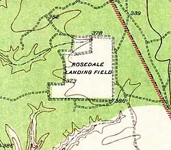 Rosedale Naval Outlying Landing Field was built as Rosedale Field in 1938 just south of Camp Kearny. Rosedale Field was used for San Diego Naval Air Station's aircraft carrier plane high-altitude bombing, dive-bombing and strafing practice. Also for emergency landing activities. After the war in 1945, the Landing Field was abandoned and no trace remains.[14]