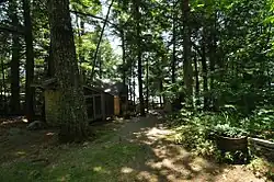 Camp Ossipee is located in eastern Holderness, on the south shore of Mooney Point, a peninsula projecting into Squam Lake's west side. It consists of two main camp buildings, four outbuildings, and a short railroad to facilitate the movement of supplies from the access road to the main buildings, which are set down a slope near the water. The older of the two camp buildings is a single-story frame structure, finished in wooden shingles and roughly shaped in a broad V. The water-facing facade is covered by a full-width screened porch which uses slender logs for support. The interior of the building is rustically finished, with a hexagonal living room at its center. The newer of the main buildings is a roughly rectangular single-story frame structure, set further back from the water to the east of the older one.[3]