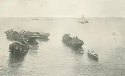 In March, Brig. Gen. Loyd Wheaton's forces had fought its way through Pasig, Pateros and Taguig along the Marikina, Taguig and Pasig Rivers to Laguna de Bay, cutting the Filipino army into northern and southern components and allowing gunboats to patrol the lake.[39] The Laguna de Bay campaign was conducted between April 8 and 17, 1899. While MacArthur's column had been hammering the insurgents along the railroad to the north, Major General Henry Lawton took his column south, captured Santa Cruz in the Laguna de Bay area on April 10, and returned to Manila on April 17.[40] Otis recalled Lawton from the Laguna de Bay Campaign despite Lawton's desire to capture the town of Calamba.[41] As Lawton's forces departed, they could see Filipino troops reoccupying Santa Cruz.[42]