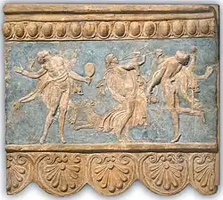 Nearly all Campana reliefs are from Central Italy, especially Latium. The largest and most important workshops seem to have been in Latium, especially in the neighbourhood of the city of Rome. Outside Latium the tiles are found mostly in Campania and in the former Etruscan sphere. At the end of the 1990s Marion Rauch compiled the reliefs with Dionysiac-Bacchic themes and was able to confirm this range for the motifs she was investigating. Nile scenes[6] are found only in Latium. No pieces have been found in the Greek areas of southern Italy or in Sicily.[7] An example from the Akademisches Kunstmuseum in Bonn, showing a Nike killing a bull was allegedly found in Agia Triada in Greece.[8] Some stuccoed examples derive from the western part of the Roman empire, the ancient regions of Hispania and Gaul (modern Spain and France).[9]