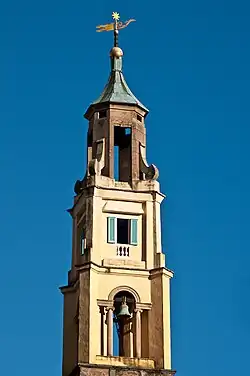 At seven-storeys in height, Williams-Ellis planned the tower to be the most prominent building and focal point for his new village.[3] Displaying his knowledge of architecture, the tower is in a classical design, similar to the Italian church towers it set out to imitate. The four lower levels are in bare stone and the upper three levels are plastered.[5] The lowest of the plastered levels (level five) has a bell hanging in each of its Serlian window openings.[5] The tower is topped by an octagonal cupola. At the apex of the copper roof is a golden ball and, on top of that, a weather vane.[2]