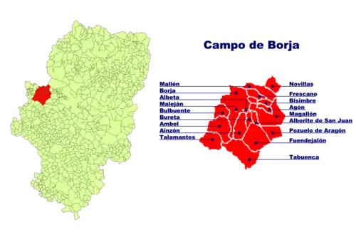 Campo de Borja is a comarca (district) in Aragon, Spain. It is located in the province of Zaragoza, in a transition area between the Iberian System of mountain ranges and the Ebro Valley. Its capital is Borja.[1]