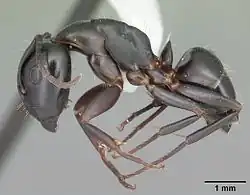 Workers can range from 3.5 to 7.5 mm (0.14 to 0.30 in) in length.[1] The queen ant's size can range from 4 to 10 millimetres (0.16 to 0.39 in).[2] This species can be distinguished from other subgenus by little amounts of erect hairs on the gena, limited erect hairs on the clypeal disc and finally by the color which is a concolorous dark brown-black.[1]