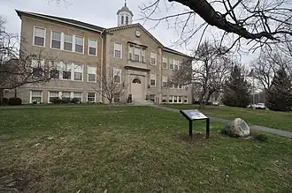 American and French military leaders decided to join their forces outside British-held New York City in 1781, during the American Revolutionary War. This required Rochambeau's French army to march west across Connecticut, which it did in summer of 1781. The army's 10th camp was in Newtown, then a small community in western Connecticut. This encampment was one of the largest in Connecticut, since all four French regiments were encamped here simultaneously prior to beginning their southwesterly march toward New York.[2] Two of the regiments were encamped on a low rise a short way east of the village center, including the area where the Hawley School now stands. French maps of the period also show a second large encampment area farther east near Sandy Hook, and a smaller camp for advance forces on a rise west of the village.[3] Officers were quartered at the Caleb Baldwin Tavern.